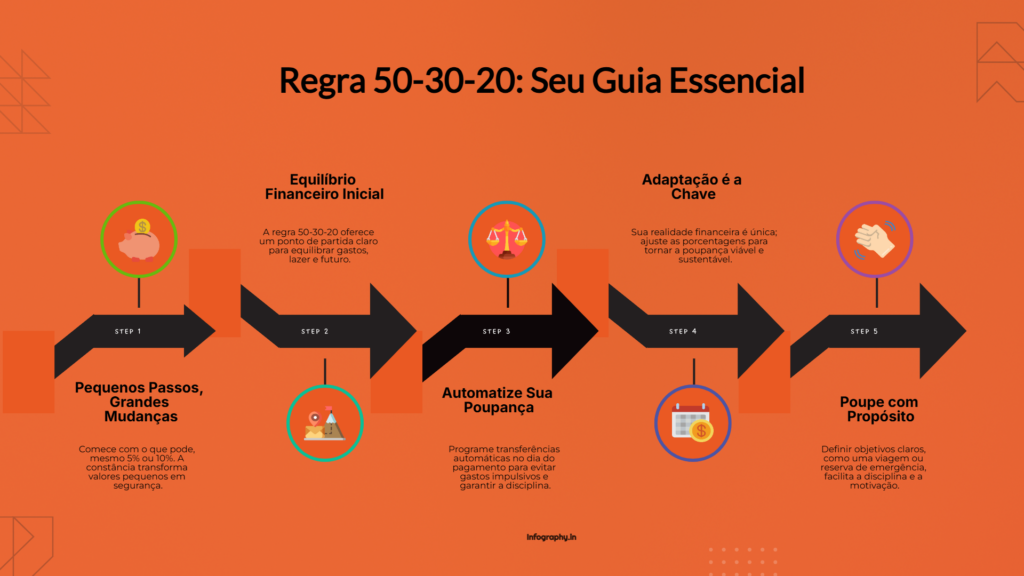 - 50% para necessidades (moradia, alimentação, transporte, saúde);